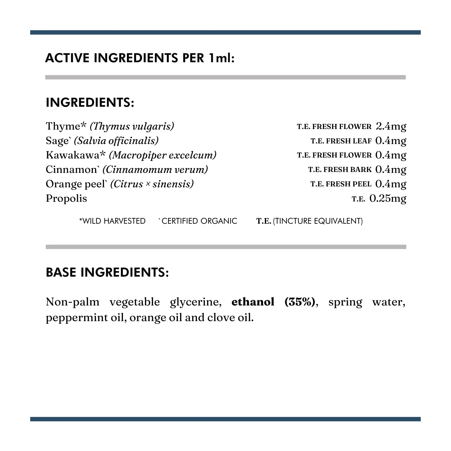 Pocket-sized yet powerful, our Throat Spray is a must if you want immune protection while travelling or are starting the feel the tickle of a sore throat. We've included organic sage for its antibacterial and antiseptic actions, which help prevent 'bugs' from entering your body via your respiratory system. The addition of clove has a numbing effect which helps ease a sore throat when you're sick. Sage, along with thyme and propolis, help reduce inflammation, making it an excellent solution for sore teeth, swollen gums, or gingivitis. Whatever life brings, you can feel secure knowing there's always a powerful first response at hand.