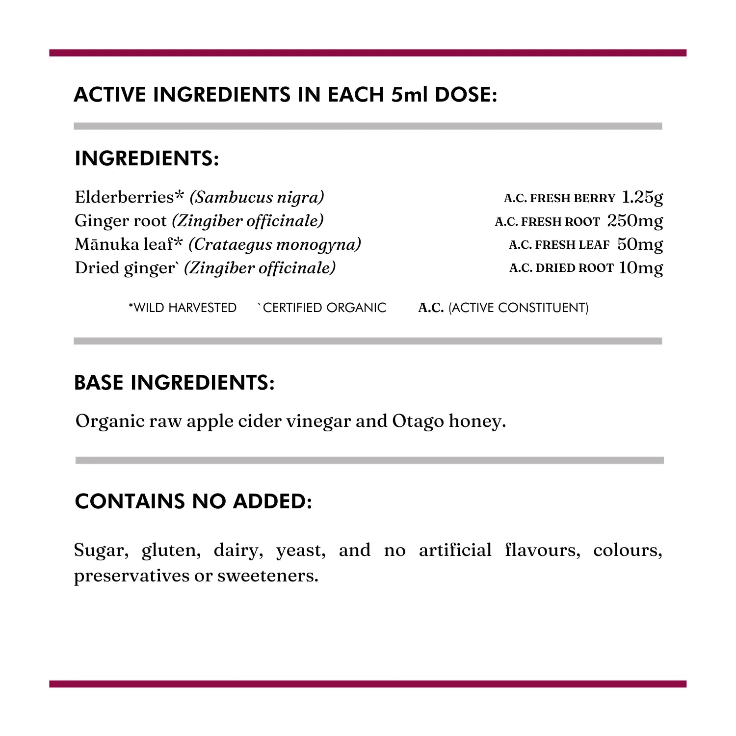 Looking for a tasty way to make healthy habits stick? Our Elderberry Switchel is the perfect solution. Made with raw organic apple cider vinegar, this refreshing tonic is infused with a blend of wild-harvested elderberries, ginger root, native mānuka, and Otago honey. These natural ingredients work together to support your immunity, digestion, and energy levels.