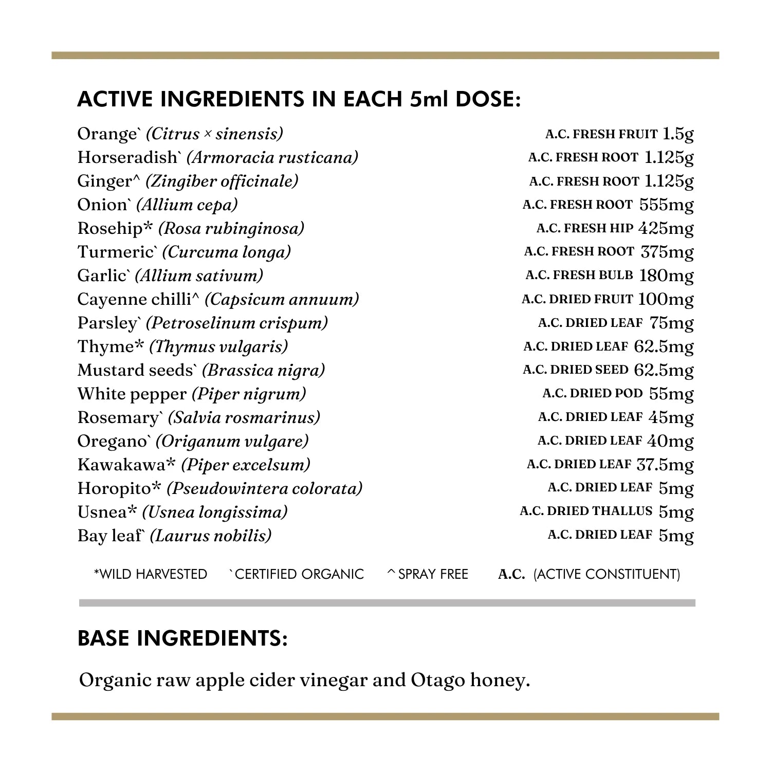 Wanting to support your digestion, circulation and immunity all-in-one? Try our Fire Cider for an easy and delicious way to kick your body into gear. This spicy apple cider vinegar-based tonic is infused with 20 different ingredients, providing a powerful first response for immune support. Apple cider vinegar is known for its ability to aid digestion and balance blood sugar and ginger, garlic, kawakawa and horopito all support a healthy immune system. Made with versatility in mind, this warming tonic is perfect mixed with hot or cold water. Or you could join the brave and take it neat.